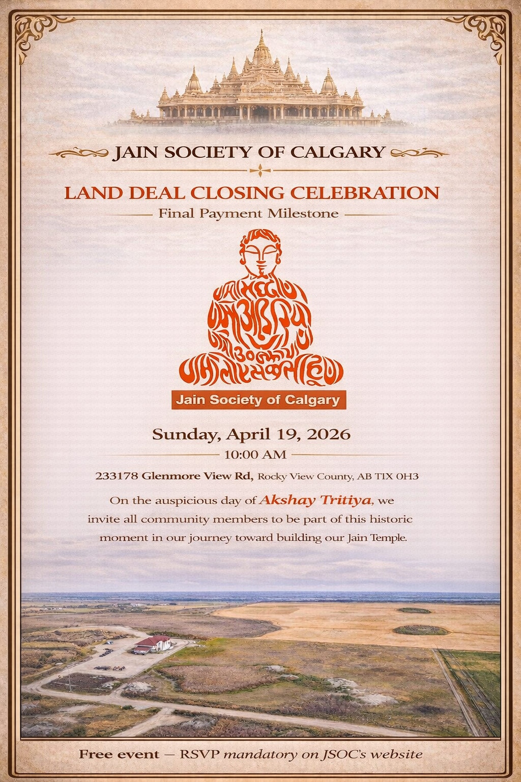 Jain Society of Calgary – Land Deal Closing Celebration by Jain Society Of Calgary 7 7 people viewed this event. Register for event To register for this event please visit the following URL: https://jainsocietyofcalgary.com/users//eventlist/eventdetails/d7d5067532739e5d5f4878e8aa4ca59d → Date And Time 2026-04-19 @ 10:00 AM to 2026-04-19 @ 12:00 PM Registration End Date 2026-04-17 Location 233178 Glenmore View Rd, Rocky View County, AB T1X 0H3 Share With Friends Facebook Twitter Linkedin Xing Pinterest